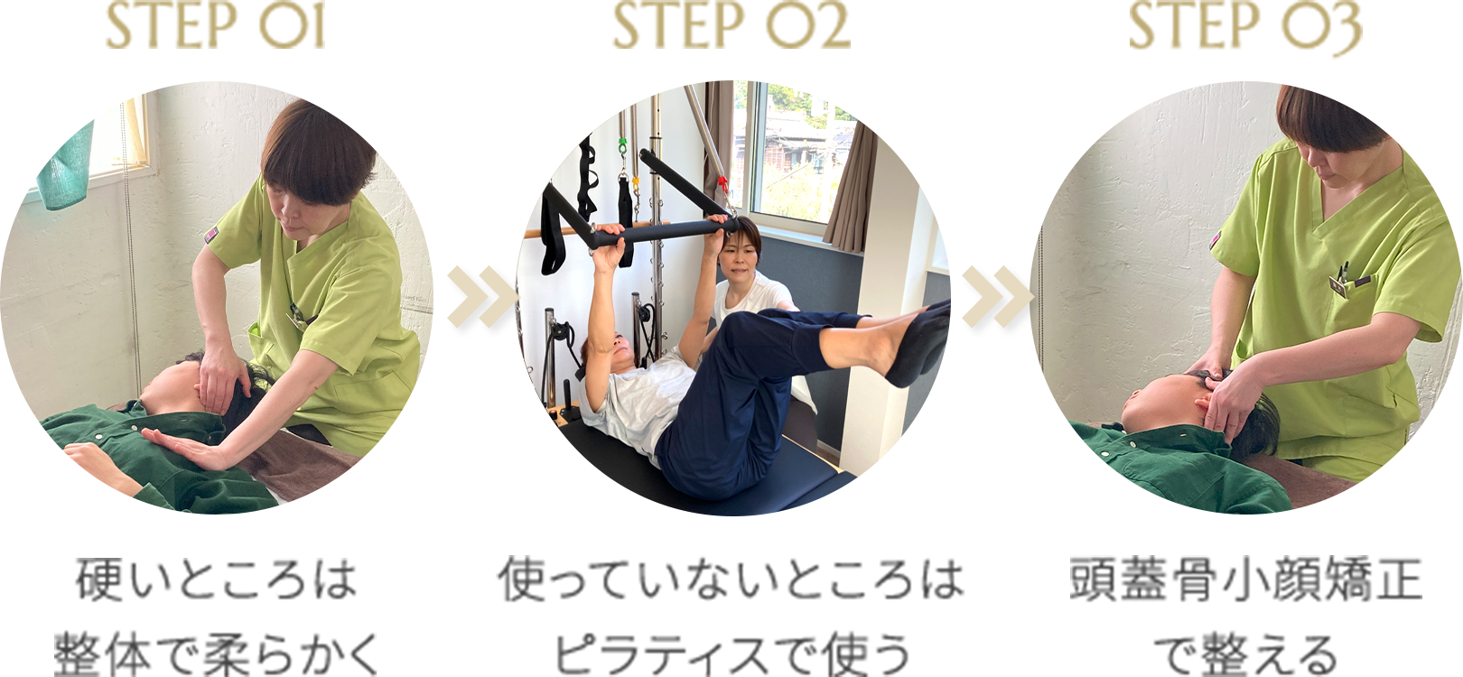 身体が痛い・硬い部分が多いなら整体をしっかりめに、お顔のこわばりが気になるなら小顔矯正をいれて、、、お客様の状態にあわせて、小顔矯正・整体・ピラティスから組み合わせるので効果が出やすいです。